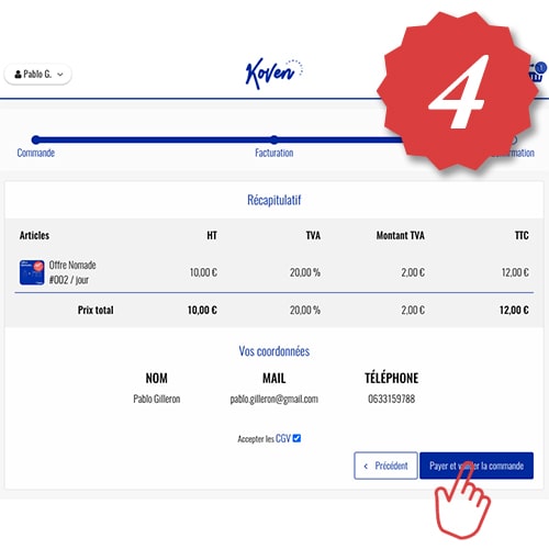 4. Une fois identifié, le récapitulatif de ma commande s’affiche. Je clique sur « Accepter les CGV » puis « Payer et valider la commande » pour passer à l’étape de paiement.