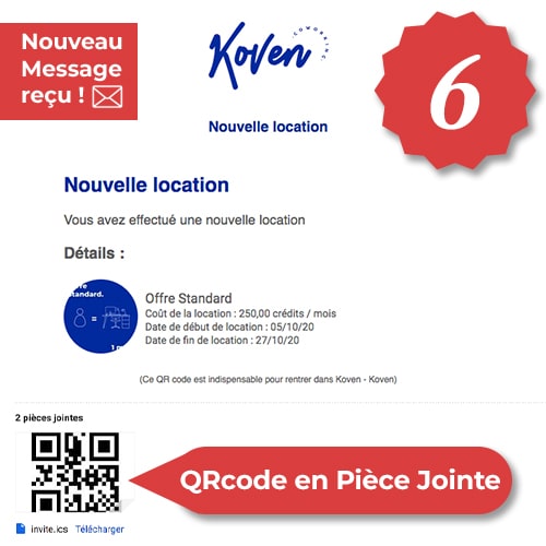 6. Une fois la validation enregistrée je reçois, 15 minutes plus tard, un email de confirmation contenant mon QRcode d’accès à l’espace. (NE PAS JETER CET EMAIL!)